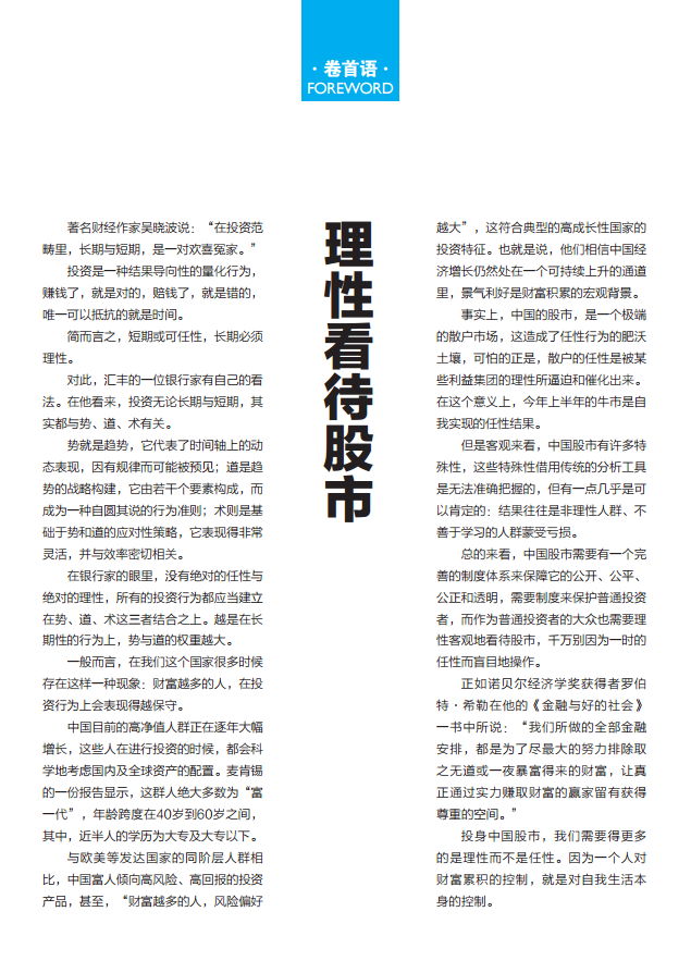 刘荣桃说,他看过太多在股市上亏得血本无归的人,作为一 个曾亏到想跳楼的人,他太了解这群人的泪水与苦痛。这些人往 往又都是一些没有任何常识,连基本规则与风险都没摸清,便毫 不犹豫投身其中的傻大胆。