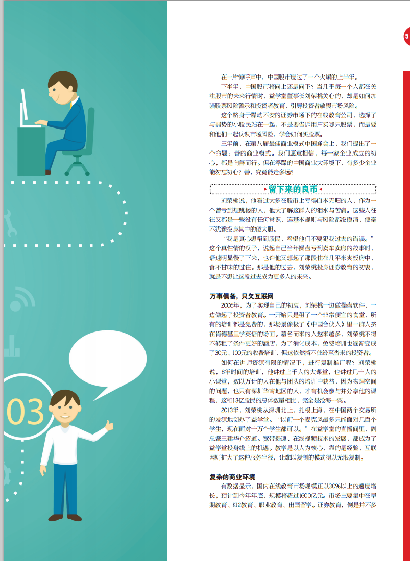 这个跻身于躁动不安的证券市场下的在线教育公司,选择了 与弱势的小股民站在一起,不是要告诉用户买哪只股票,而是要 和他们一起认识市场风险,学会如何买股票。
