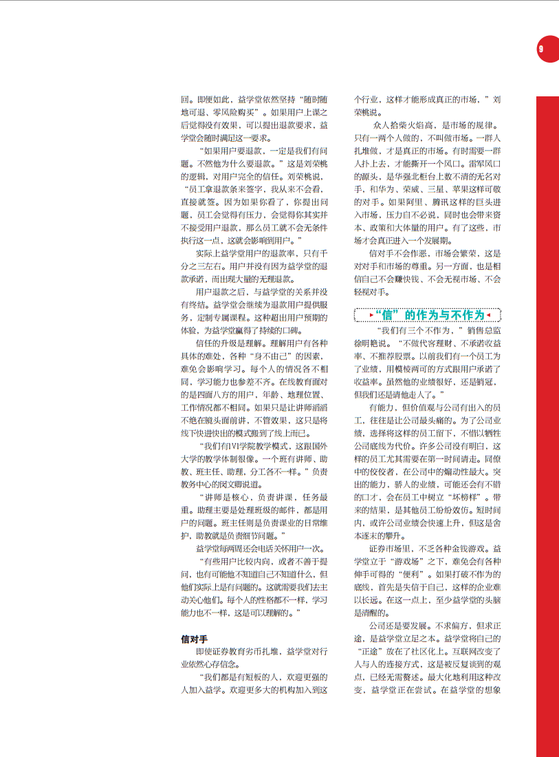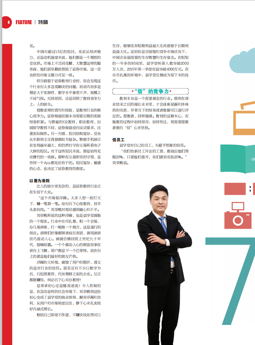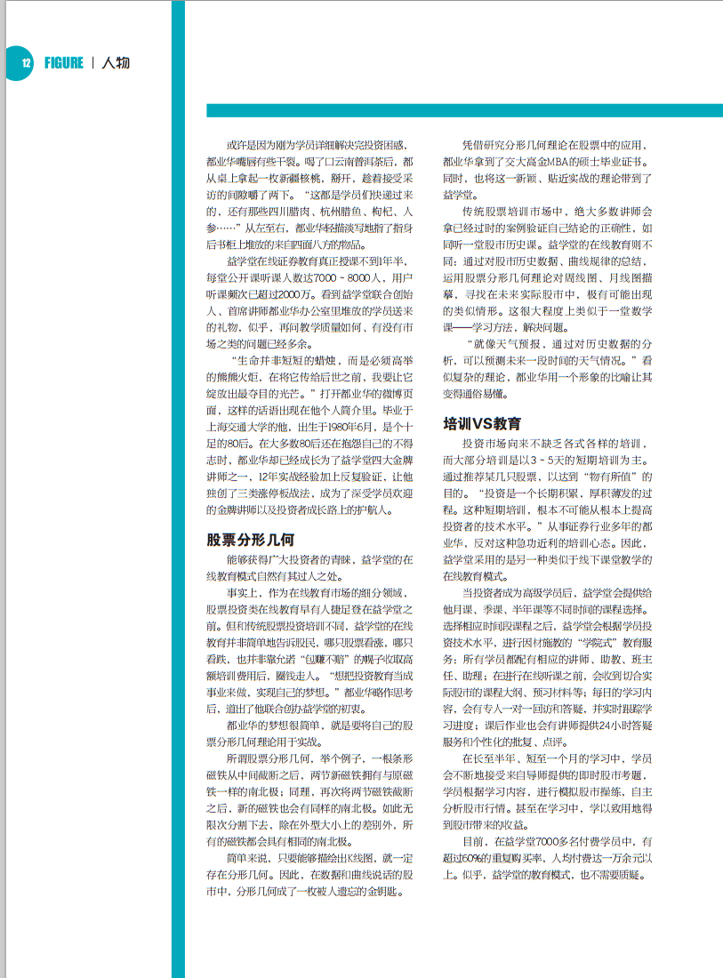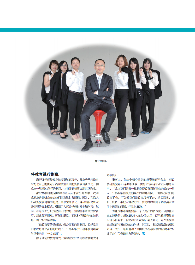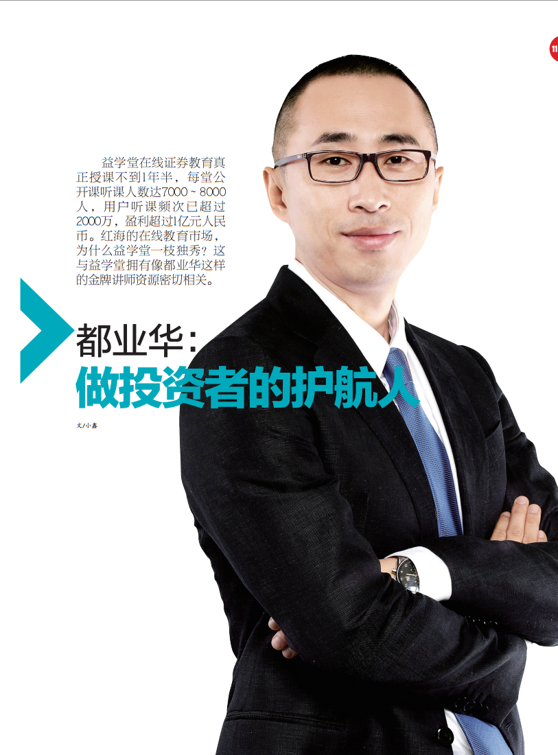 将教育进行到底 离开证券市场转身做投资教育服务,都业华从来没有 后侮过自己的决定。而益学堂引领的投资教育新风向,和 成立一年超过1亿元的利润,也在印证着他决定的正确性。