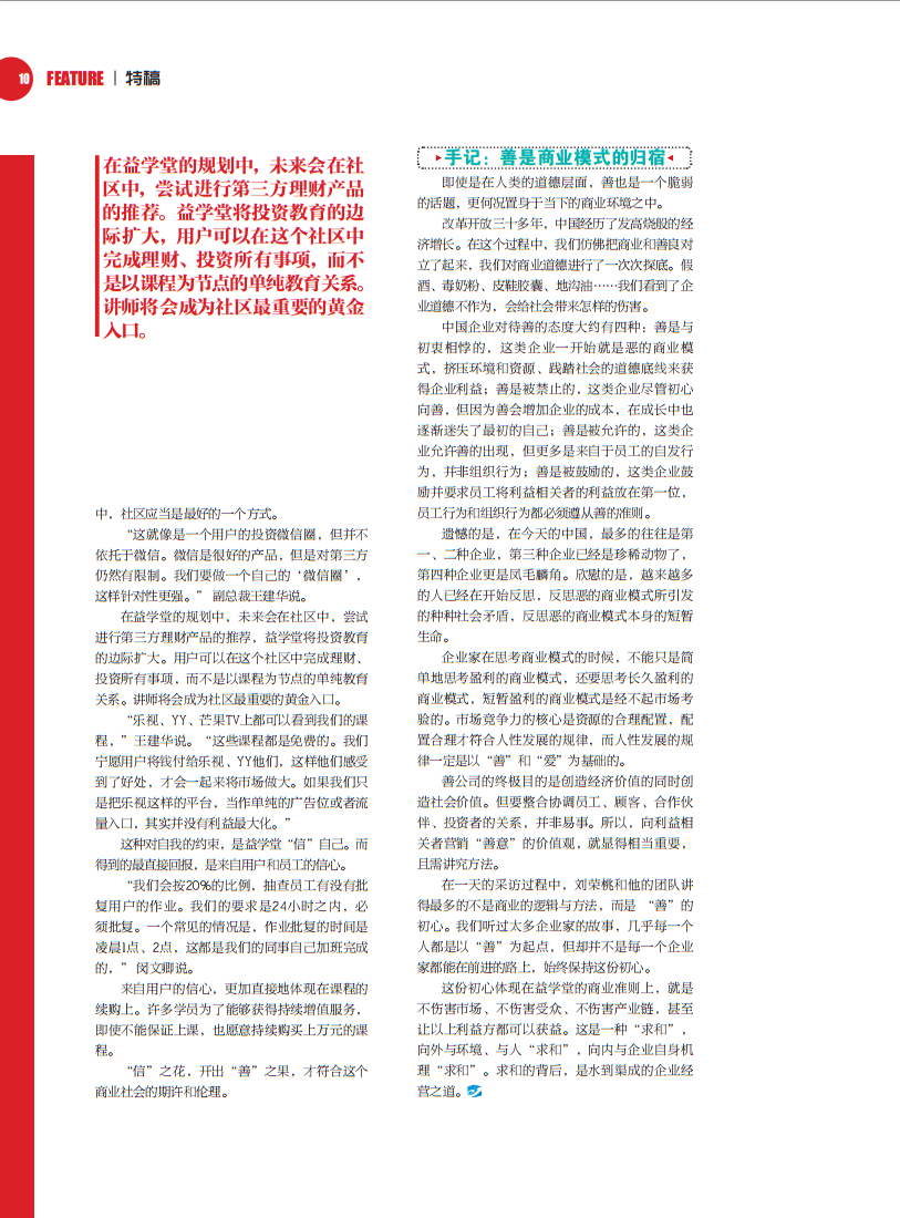 是秉承初心还是随波逐流?令人钦佩的是,在急功近利的社会环境下,刘荣桃将这份初心变成了益学堂的商业准则,摒弃浮躁和功利,从用户和市场角度出发,静下心来扎实做好内涵式增长。